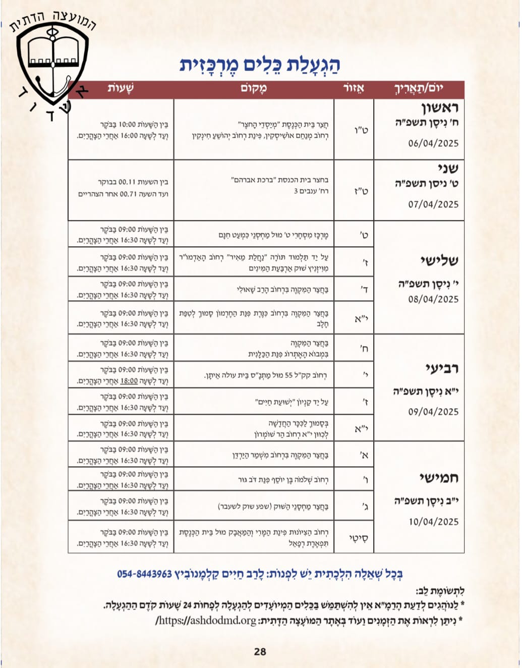 לקראת חג הפסח העמידה המועצה הדתית 13 עמדות של 'הגעלת כלים' להכשרתן ללא תשלום! ברובעי העיר. נקודות הגעלת הכלים יחלו כבר השבוע ביום ראשון ח' בניסן 6.4.25 לפי הטבלא המצורפת ב"אתר המועצה הדתית", עד לתאריך ערב בדיקת חמץ יב' בניסן 10.4.25.