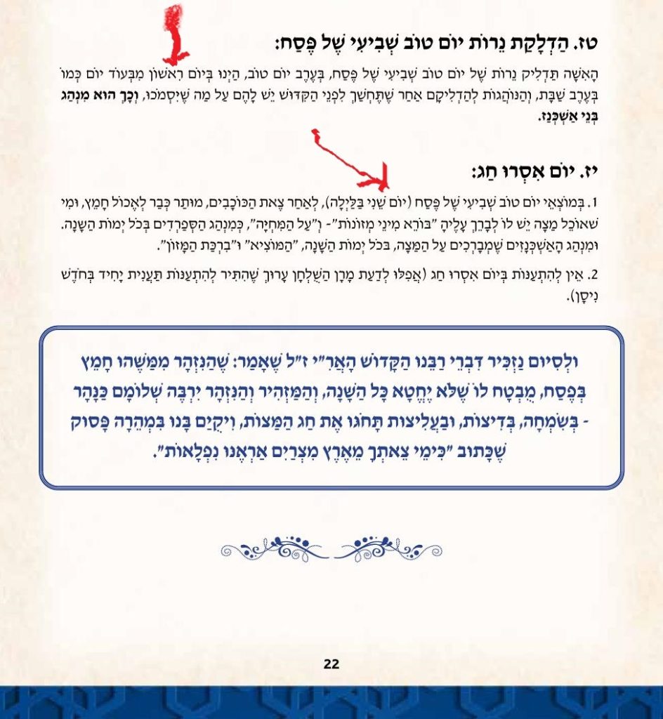 לידיעת הציבור בחוברת פסח "הלכות ומידע" לחג הפסח תשפ"ה נפלה טעות מצערת תוך כדי הגהה בעמוד 22 בשני הסעיפים טז' ו-יז' לגבי הדלקת נרות בערב שביעי של פסח ויום איסרו חג.