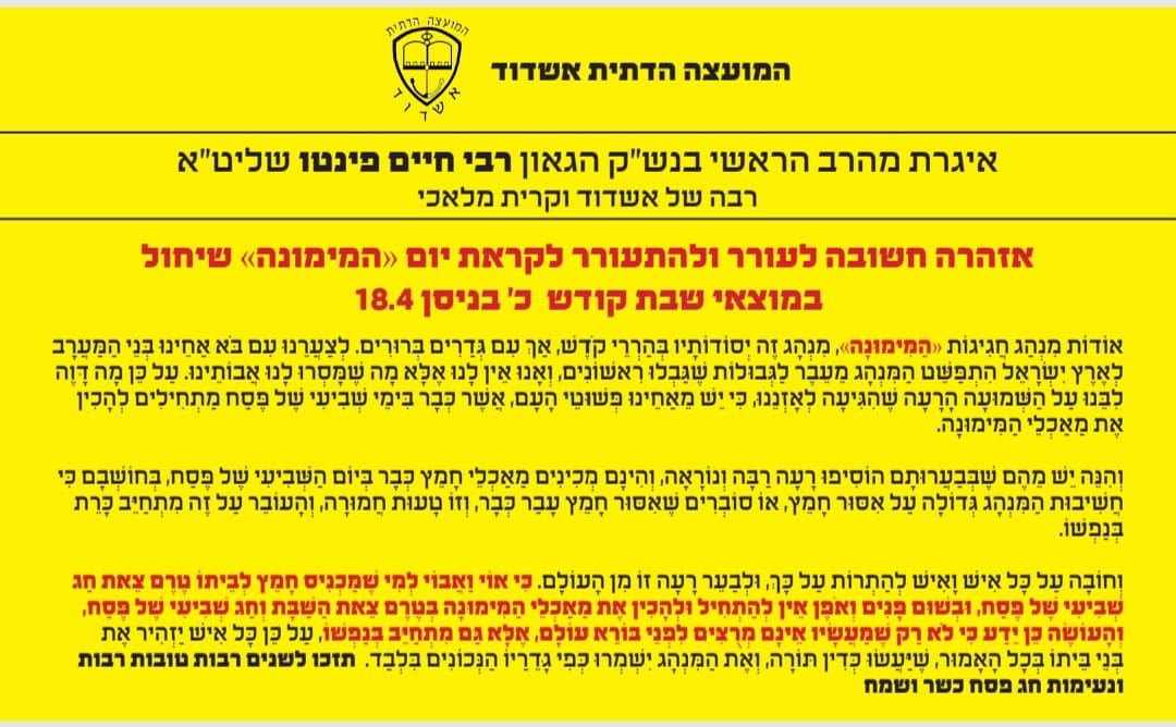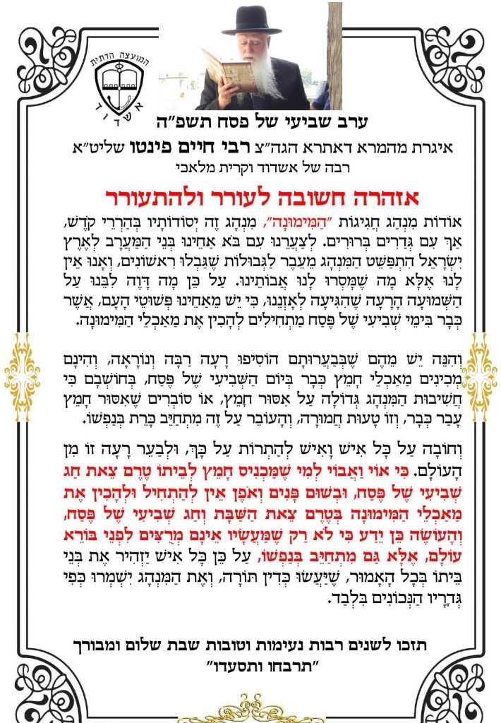 אזהרה לקראת "חג המימונה" שיחול במוצאי שבת: הרב הראשי לאשדוד הגה"צ רבי חיים שמעון פינטו פרסם איגרת לתושבי העיר בענין איסור הכנת מאכלי חמץ בשבת וחג "שביעי של פסח" לקראת "חג המימונה"