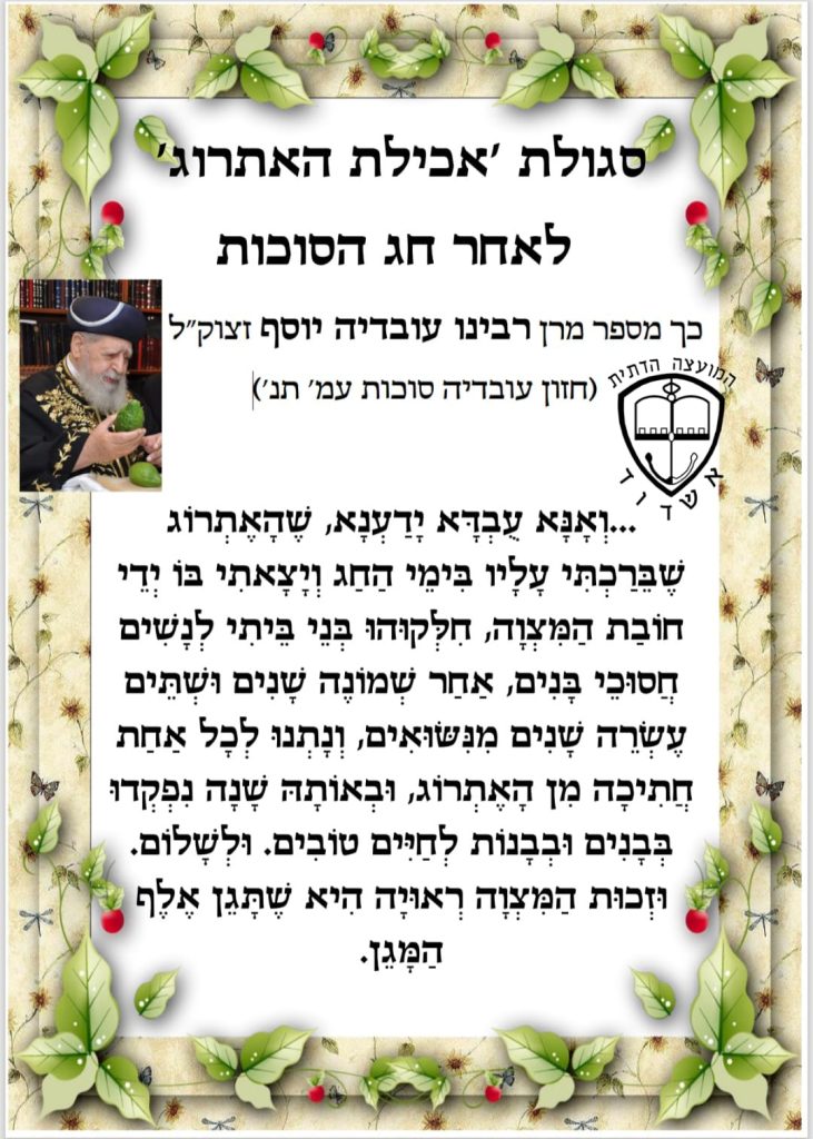 כמו כן הביאו את דבריו הנרגשים של מרן הרב עובדיה יוסף זצוק"ל שכתב בספרו חזון עובדיה סוכות בעמ' תנ' על סגולת אכילת אתרוג שבירכו עליו בחג הסוכות לזרע בר קיימא. מרן זצוק"ל מעיד כי מה שידוע לו שבני ביתו חילקו חתיכות מהאתרוג אשר בירך עליו בחג הסוכות וזכו נשים אשר 8 או 12 שנים לא זכו לפרי בטן ובאותה שנה נפקדו.