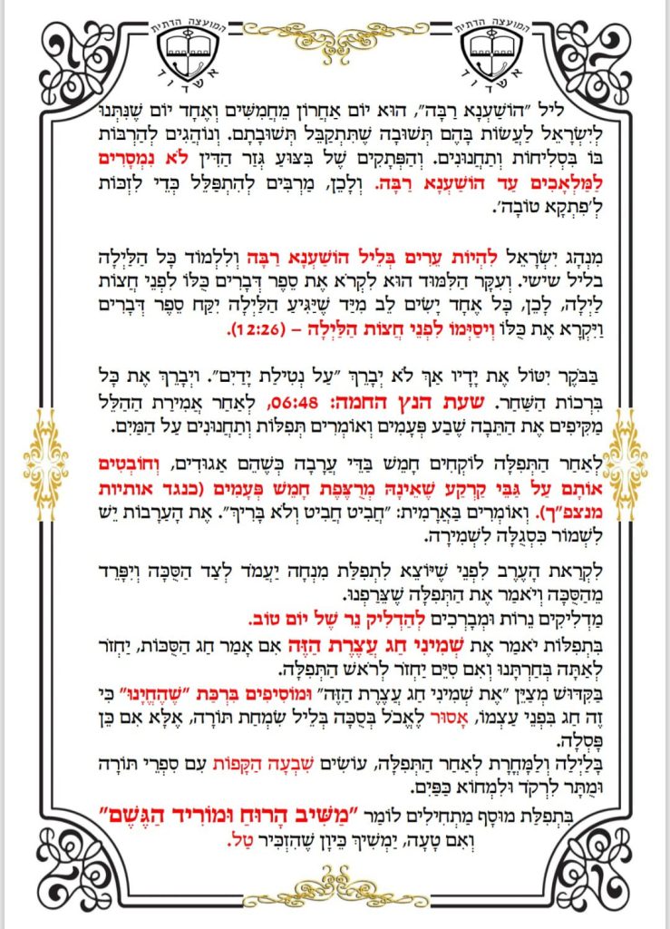 במועצה הדתית פרסמו את ההכנות לקראת יום קדוש זה והזמנים החשובים של חצות לילה ונץ החמה, מנהג חביטת הערבה והלכות קצרות של חג שמחת תורה ותפילה מיוחדת לפני שנפרדים מהסוכה המובאת בספרים הק' שצריך להתפלל שנזכה שהמלאכים של המצווה ילוו אותנו כל השנה לטובה ולברכה ולשמירה לעשות עבודתו יתברך עטופים ומסובבים באמונה וקשר עם השם יתברך – כמו שהסוכה סיככה עלינו כל ימי החג.
