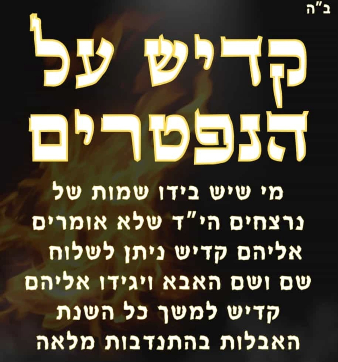 יוזמה מבורכת: קדיש לעילוי נשמת הנרצחים ביום שואת שמחת תורה יוזמה מבורכת של אדם פרטי, אשר קיבל על עצמו לומר קדיש כל השנה הראשונה לזכרם