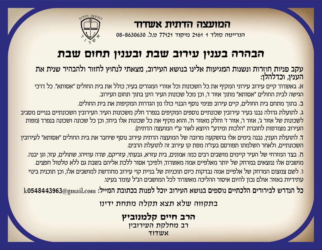 הבהרה בענין העירוב לבית החולים "אסותא" – הרה"ג ר' חיים קלמנוביץ רב מחלקת עירובין ורב שכונה עונה בפירוט בנושא עירובין בעירנו # בית החולים נכלל