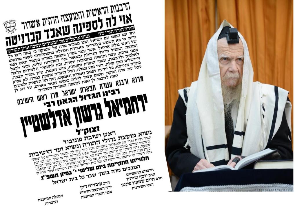 נשבה ארון הקודש: מרן הגאון רבי גרשון אדלשטיין זצוק"ל נשיא מועצת גדולי התורהבצער רב הגיע הידיעה כי נצחו אראלים את המצוקים: מרן ראש הישיבה הגאון