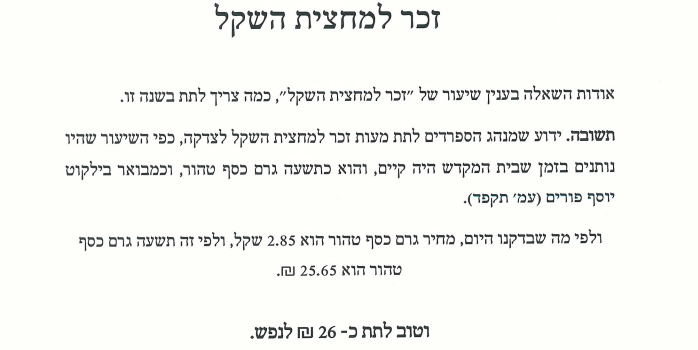 מצות “זכר למחצית השקל” לשנה זו – תשפ”ג, ע”פ פסק הראשון לציון הגאון רבי יצחק יוסף שליט”א, המכתב בפנים Lorem ipsum dolor sit amet, consectetur